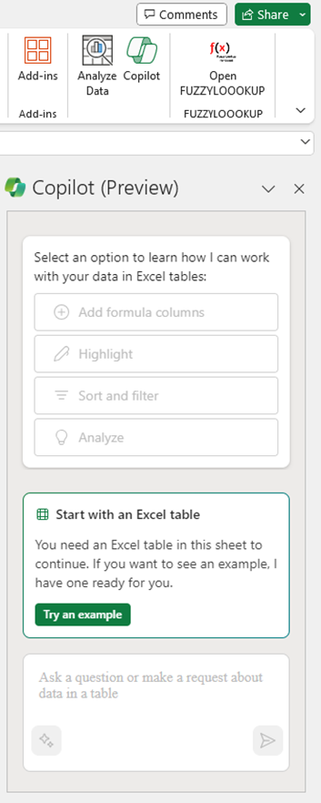 Copilot in Excel is accessed via the Copilot button in the top right corner of Excel. If you do not currently have a table, Copilot can give you example data to use.