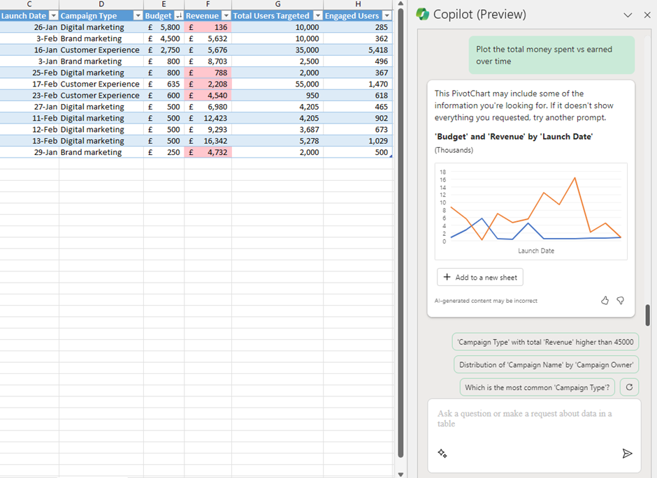 Data on its own is just data, it’s what we do with it that turns it into knowledge and action. Copilot in Excel can understand your data which drives your data-driven outcomes. One of the prompts I can ask Copilot in Excel is to “Plot the total money spent vs earned over time”. Copilot will analyse the data, recognise a date column, a budget column, and a revenue column. Then Copilot suggestes a graph type for me and options to insert this visualisation.