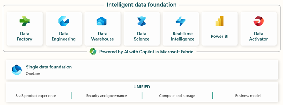 The diagram below shows the different experiences and illustrates how, in unison, they build the Intelligent data foundation with OneLake.